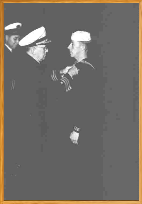 Picture below is of Purple Heart being bestowed on Theodore Treglown, S1C, by Commander J M Young, Executive Officer. Lt William J Pitt at left, September 15, 1943