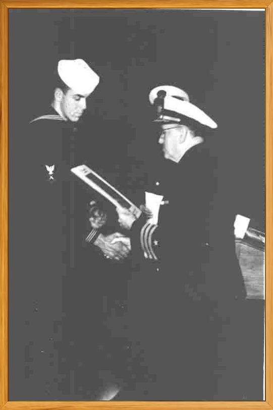 Picture below is Commander J M Young giving award at Brooklyn Naval Armed Guard Center, October 1943