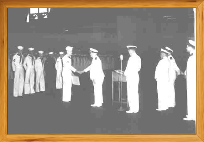 Picture below is Commander William J Coakley, Brooklyn Armed Guard Center, giving awards at Captain's Inspection, Main Deck, July 1943