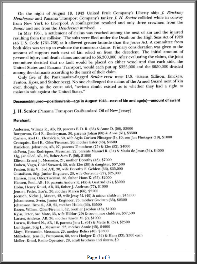 The night of horror was described by messman Karl O. Ruud of the SENIOR in Ships of the Esso Fleet in World War II, an official history of the wartime tankers operated by the Standard Oil Company of New Jersey.