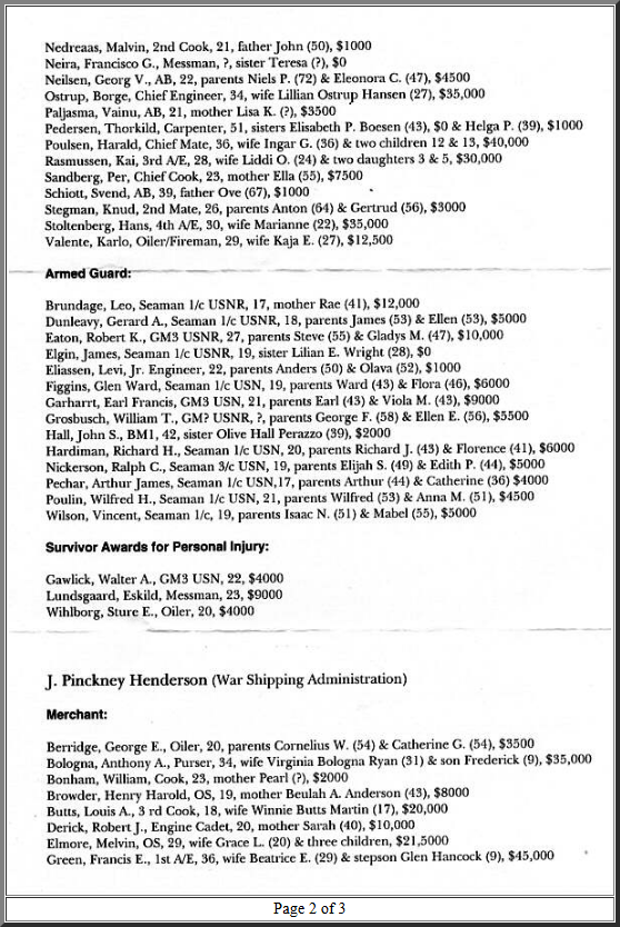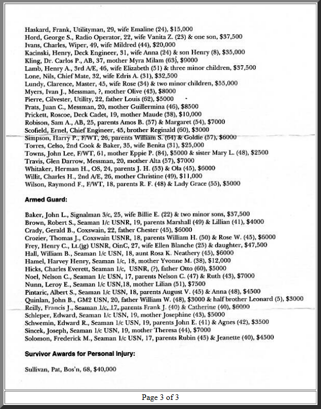 The following documents show the payments made to families who lost members of the merchant crew and gun crew in the collision: