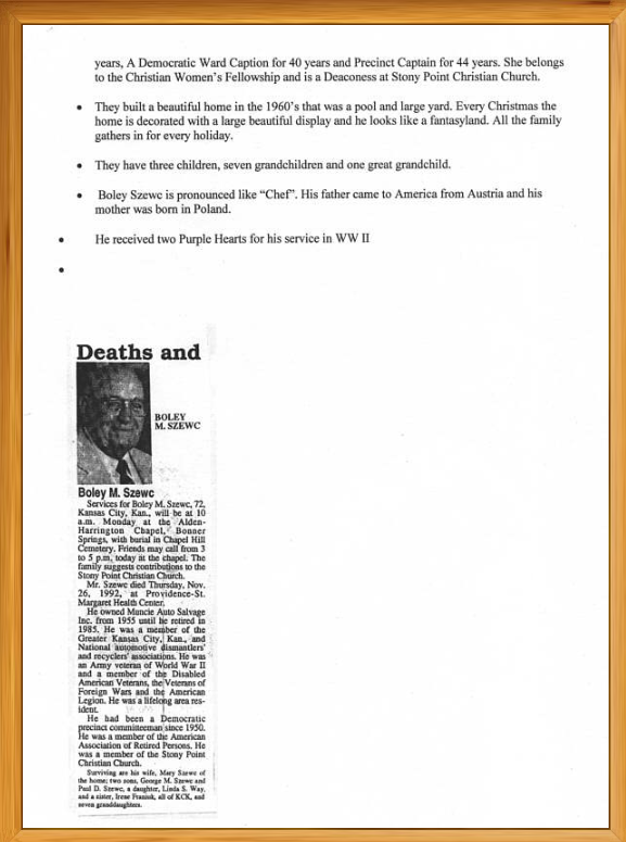 This information on Boley M Szewc was furnished to me by Bonnie Bryan and the story is told so well it is not necessary to provide an introduction. I will just say that as I read it I felt highly privileged to read the story of this man who gave so much to this country and asked for so little.
