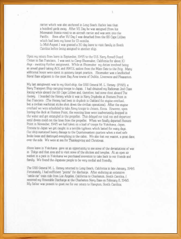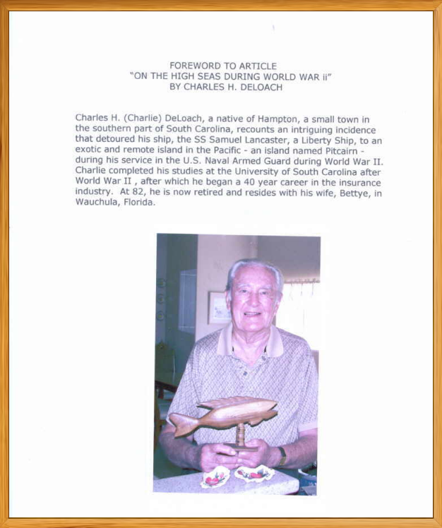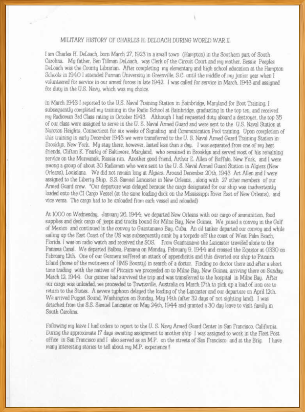 This page honors Charles H Deloach, US Navy Armed Guard. Documents and pictures below document his Honorable Service to his country.