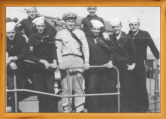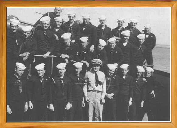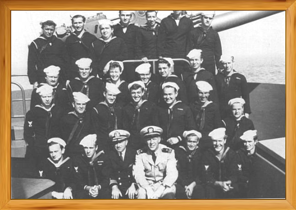 Shown below is Lt(jg) N.S. Millard with gun crew aboard the SS John Stevenson. Delmar H. Vaught, SM 3/C, is located at the extreme lower right hand corner.