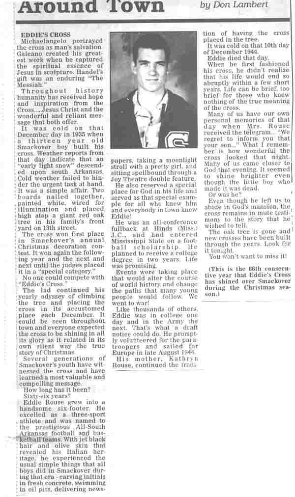 When I was a youngster I was dumped on my Grandmother every time Dad lost his job. This happened often. She lived in a little town once known as the world’s largest Oil Field, Smackover, Arkansas. One of my young friends there was a boy named Eddie Rouse. Eddie lost his life in 1944 at the Battle of the Bulge. I later learned that Eddie married before he went overseas and had a daughter he never saw. I was able to help his daughter learn more about Eddie and help her obtain his personal effects, including his dog tags and the American Flag used on his casket. The article below has run in the Smackover Journal every Christmas since Eddie died.