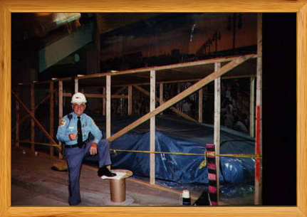 Picture of Elmer Rago with the eleven 35 MM Cameras. They all had to be in sequence with not even one frame difference. If he spliced a film and took out three bad frames he had to put three frames back.