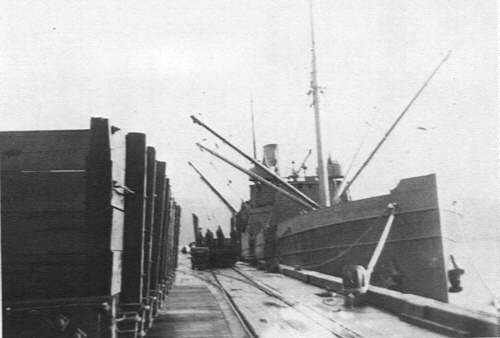 USAT King taking on fresh fruits and vegetables from barges in the Bay of Corinth, Nicaragua, July, 1945