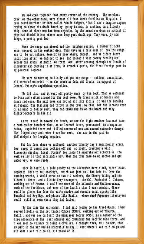 Francis B. Kent served honorably in the World War II Navy Armed Guard Service as a Radioman. The merchant ships he served on were the SS Alexander Martin, the SS Cherry Valley, the USAT Col Frederick C. Johnson and the SS Albert E. Watts. Francis presently lives in North Hollywood, California with his lovely wife, Lee. You can contact him by sending email to fkent12252@aol.com.