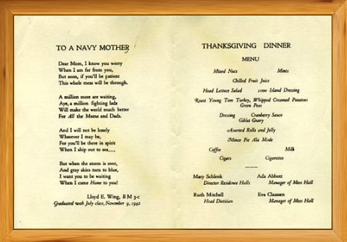 The next five pictures are from the November 26, 1942 Thanksgiving Dinner at the Radio School in Oxford, Ohio and Christmas Dinner 1942 at the Radio School at Noroton Heights, CT.