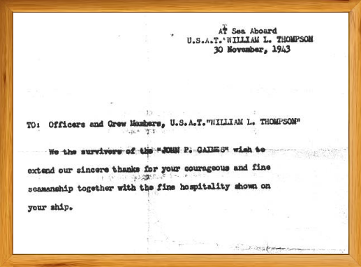 Picture Below: Copy of letter presented to the crew of the rescue ship by the survivors of the John P Gaines