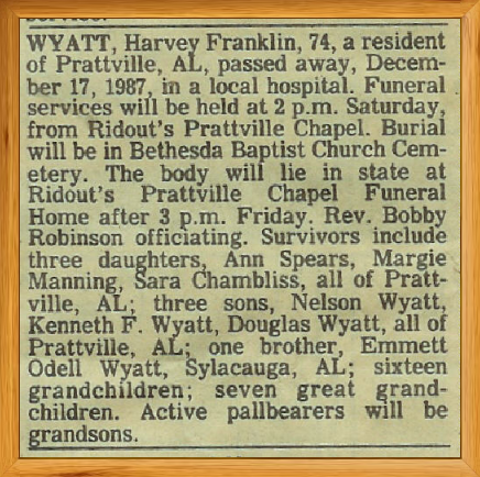 Harvey died 17 December 1987. If you knew Harvey Wyatt, send an email