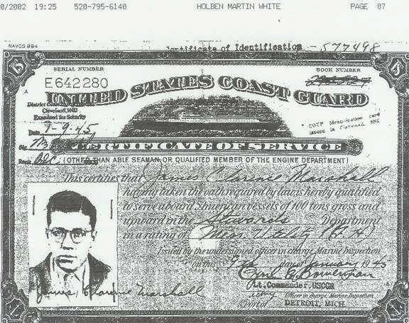 Living in the Detroit area, Jim was always interested in the water and the vessels that sailed the lakes and nearby river. Jim attended Catholic Central High School, Detroit, Michigan, in which he graduated in the summer of 1944. Even before Jim graduated from high school, like many young individuals he worked at various jobs. He worked part-time for his father at the A.J. Marshall Company from June of 1942, until June of 1944. Upon graduation from high school he worked for the Wyandott Transportation Co. Wyandott, Michigan, as a Messman on lake freighters from June 1944 to October 1944. While trying to make arrangements to join the armed forces, Jim worked for Lee F. Redman Jr. Studios, Detroit, Michigan, from October 1944 to January 1945. Because of a severe asthma condition, Jim was unsuccessful in his attempts to join the Navy, Merchant Marines and Army. His determination to serve his country during the war effort however was not effected. With his background knowledge of restaurant supplies and his experience while working on the lake freighters, Jim was able to become a part of the United States Army Transport Service, Water Division. Beginning in January, 1945, through May of 1946 Jim was assigned to three ocean-going troopships and served his country honorably.