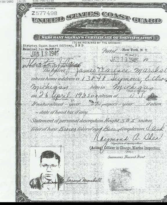 James Clarence Marshall passed on August 2, 2002, and was honored with the United States flag covering his casket in tribute to his service to his country. God Bless you Jim for your service and dedication to your country in time of need.