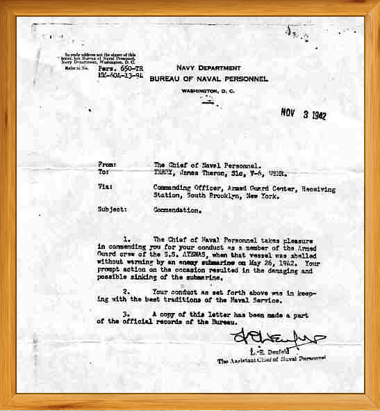 James T Terry served aboard the SS Atenas, the SS Monterey, the SS West Honoaker, the SS James W Fannin and was then at the Bermuda Naval Base and finally served aboard the USS Chilula (ATF-153). James now lives in Montgomery, Alabama with his lovely wife, Billie.