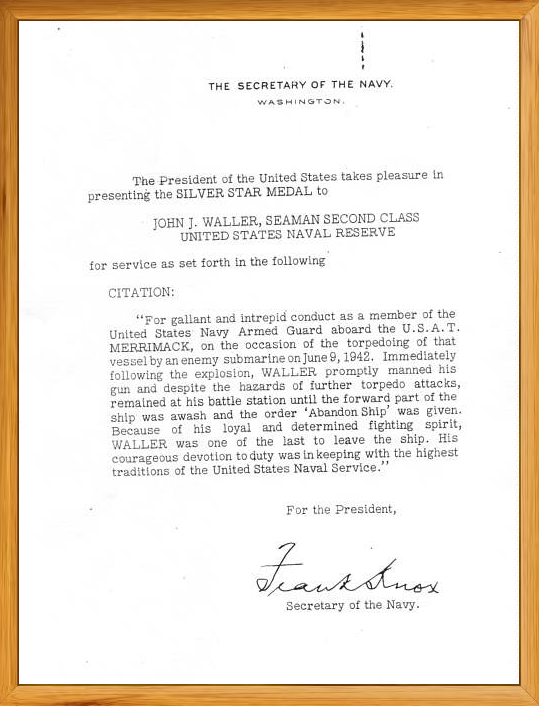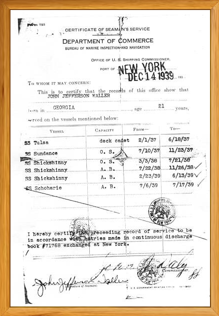 John J Waller served in the Merchant Marine in 1937, 1938 and 1939. He served