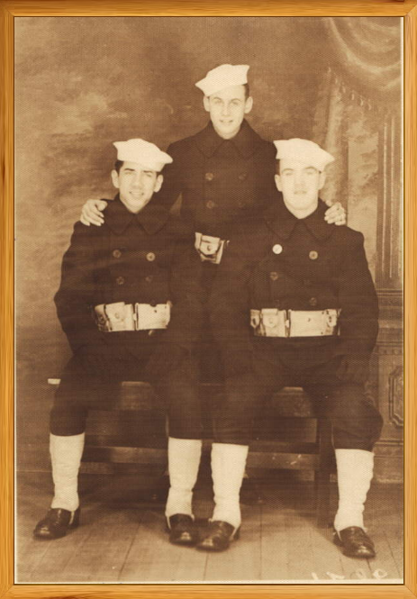 Picture Below: This picture was taken at Newport, Rhode Island Naval Training Station. On the left is Lambert, in the center is F. Zitoli, and on the right is John T White. Zitoli died in 1945 while still in the Navy. All three were in the Armed Guard.