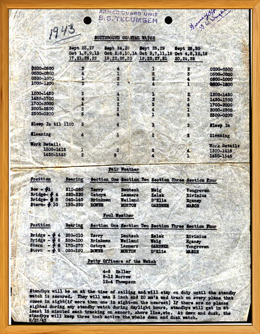 Pictured below is a copy of the Armed Guard Watch schedule for the SS Tecumseh, liberated from a bulkhead as a war souvenir.