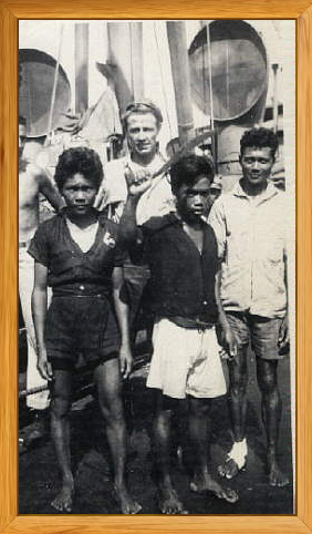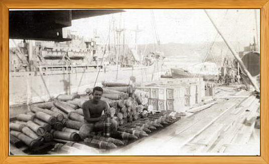 Pictured below is Lester Vongroven unloading ammo and supplies onto a barge in Manila harbor for hauling out to the 250 fathom line and dumped, approximately VJ Day plus 5. The ship is the SS Justo Arosemena.