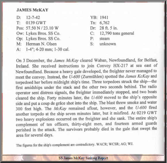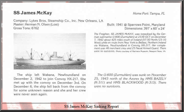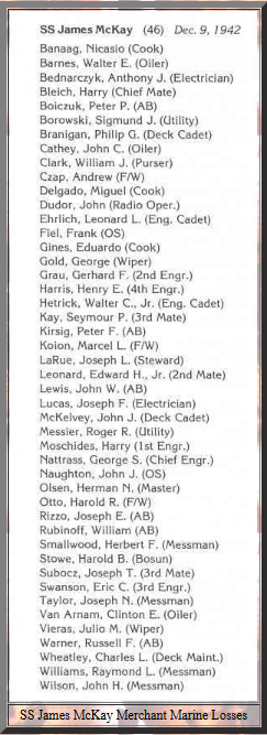 The SS James McKay was sunk and the Gunnery Officer and his 14 Navy Armed Guards were lost, as well as the entire Merchant Crew. There were no Survivors.