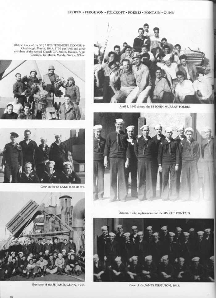 Crew of the James Fenimore Cooper: C P Smith, Holmes, Segil, Cheslock, De Mezza, Moody, Shirley, White. Crew of the John Murray Forbes, Crew of the Lake Folcroft, Crew of the Klip Fontain, Crew of the James Gunn, Crew of the James Ferguson
