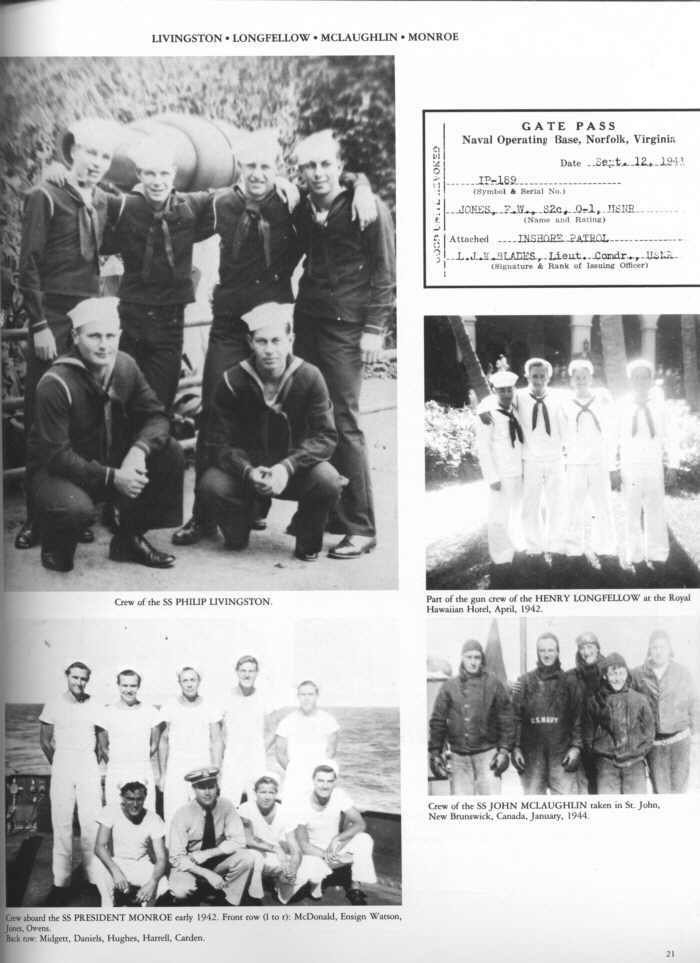 Crew of the Philip Livingston, Crew of the Henry Longfellow, Crew of the President Monroe, Crew of the John McLaughlin, Crew of the President Monroe includes McDonald, Ensign Watson, Jones, Owens, Midgett, Daniels, Hughes, Harrell and Carden