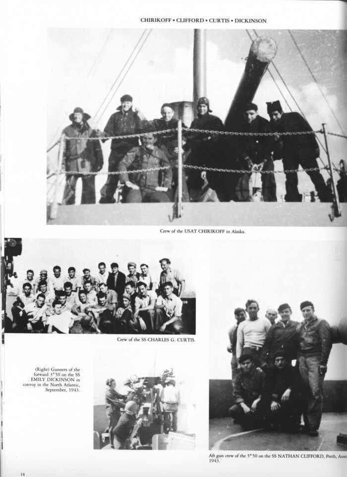 Crew of the USAT Chirikoff in Alaska, crew of the Charles G Curtis, 3"50 gunners on the Emily Dickinson, Aft gun crew of the 5"50 on the Nathan Clifford.