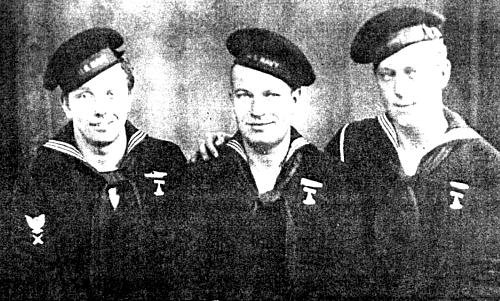 Armed Guard Gun Crew Members from the SS John Carter Rose, sunk 8 October 1942 by two German submarines. Roy L. Adams, S 2/c (Survivor) is on left. Michael J. D'Ambrosia, S 2/c (Lost in Sinking) is in center and Omer P. Coumoyer, S 2/c, (Survivor) is at the right.