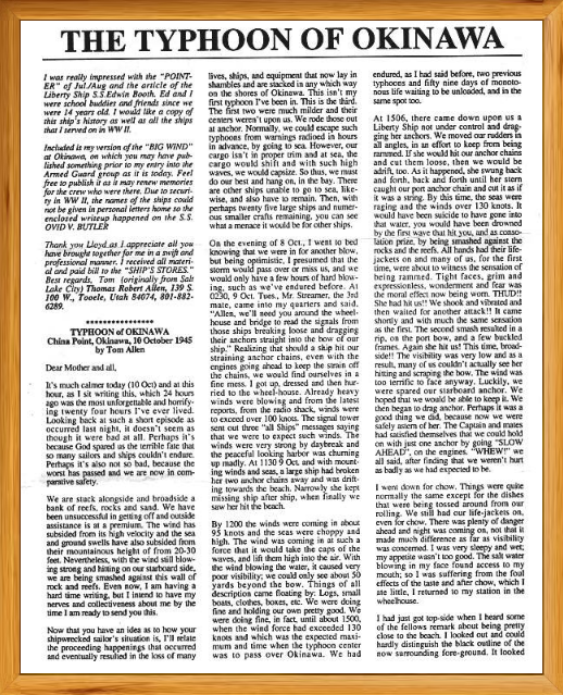 Thomas R Allen served in the World War II Naval Armed Guard as a signalman. He served aboard the SS Simeon G Reed, the SS James S Larson, the SS Orvid Butler, and later on the USS Brinkley Bass (DD-887). Tom lives in Tooele, Utah, home of the nerve and mustard gas incinerator for that area. Tom was in a terrible typhoon at sea and his account of it is included in this page.