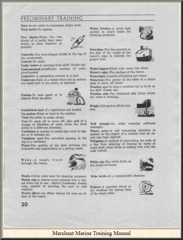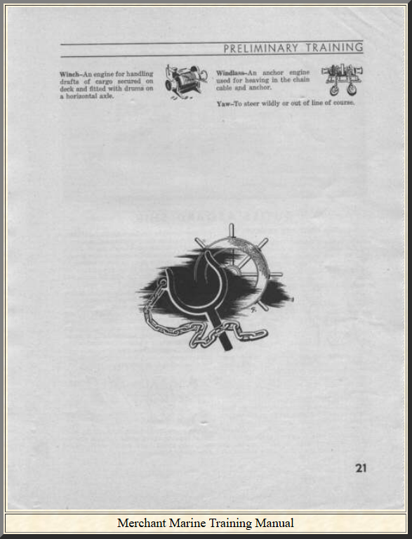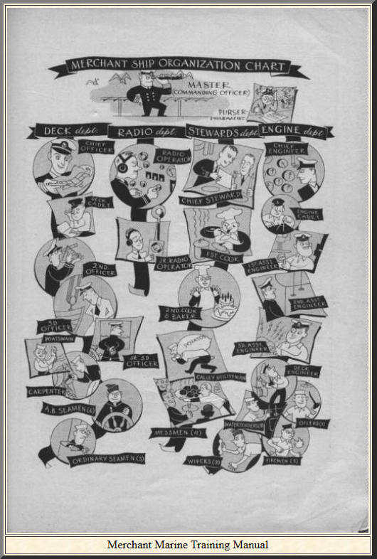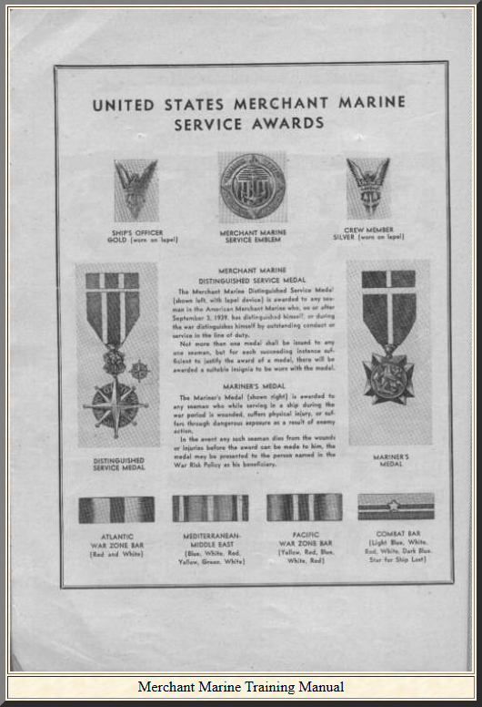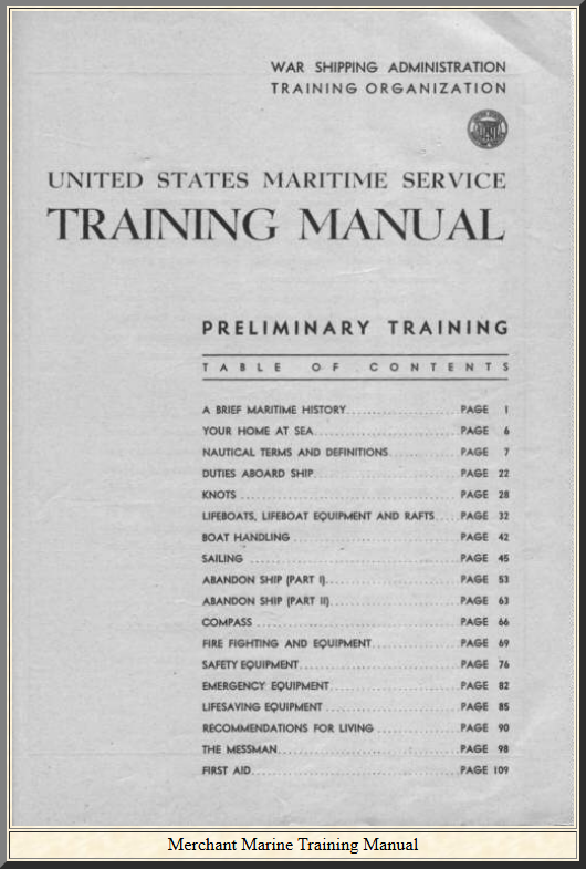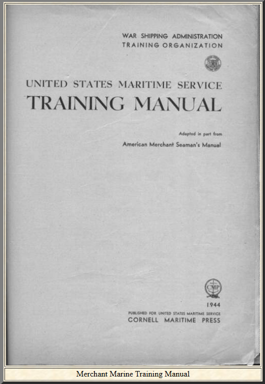 This Manual was donated to the Naval Armed Guard by Walter Mace ofNew York State. Walt served on the M/V Petrofuel, SS John B Gordon,SS Pacific Sun and on the USS Macon during the Korean War. We appreciatethe donation. Merchant Marine Training Manual Click to go to Next Page Return to Home Page