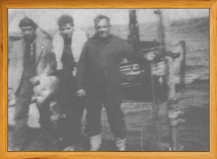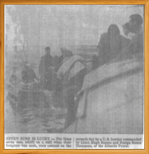 Photo of survivors aboard the rescue Corvette Battleford in Convoy SC-94. At left is Naval Armed Guard Louis DeGennaro, who kept wounded gunner William McKeon afloat until picked up by the Battleford.