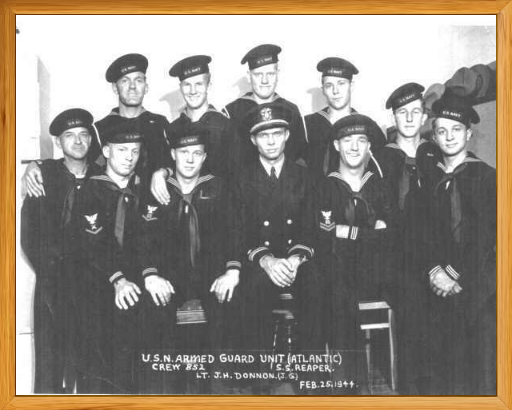 Picture of Armed Guard Crew. Tyndall is at left of the front row with GM 3/C stripes